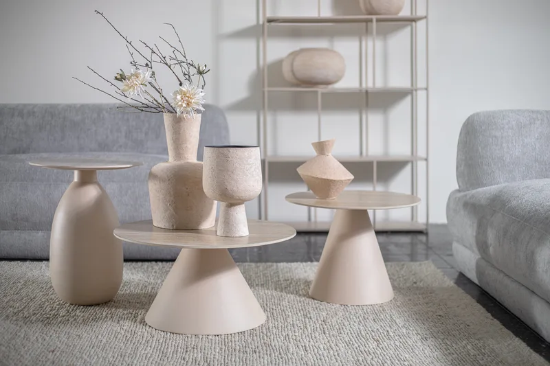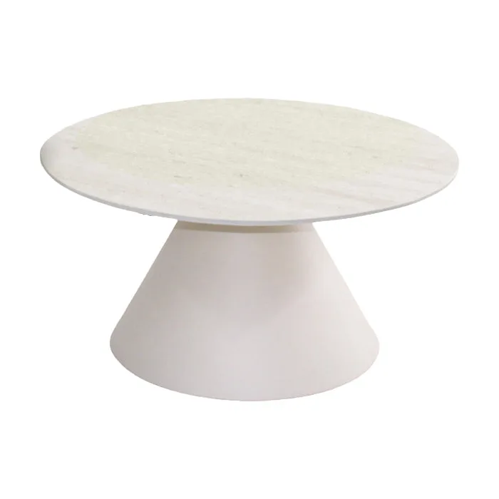 שולחן סלון המעוצב פלטת קרמיקה עגולה הנישאת על רגל מתכת זוויתית.
