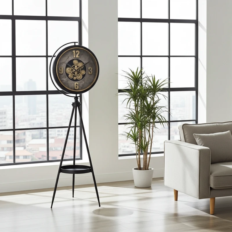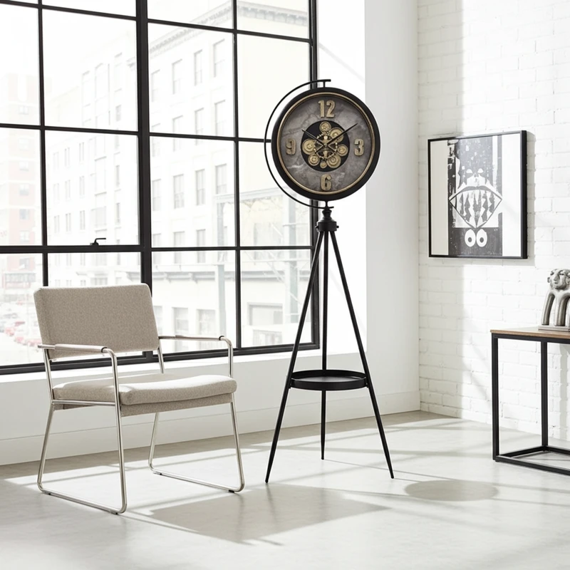 שעון עומד עוצר נשימה, המשלב עיצוב תעשייתי עם נדיעות וינטג'. מנגנון גלגלי שיניים חשוף, מוקף במסגרת שחורה אלגנטית, מוסיף נופך של ייחודיות לכל חלל. בסיס תלת רגלי יציב, מעניק מראה של כלי ניווט עתיק.