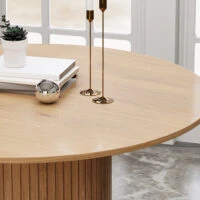 שולחן האוכל ריטמו מהווה יצירה אמנותית ופונקציונלית כאחד. הוא מציע פלטת עץ עגולה ורחבה בגימור טבעי בהיר, המונחת על בסיס עמוד גלילי מסיבי ומרשים. העמוד מעוצב בטכניקת חריצים אנכיים (פלאוטד), המעניקים לו מרקם עשיר ותחושת קצב מודרנית (ומכאן שמו). הפלטה העגולה מעודדת שיחה זורמת ויוצרת אווירה אינטימית, ללא פינות חדות. עשוי מ MDF ובציפוי מלמין איכותי במספר גוונים לבחירה, חומרים המבטיחים עמידות לאורך שנים וקלות תחזוקה. מתאים לחללי אוכל מרכזיים או פינות אוכל קטנות יותר, ומכניס נגיעה חמה של טבע ועיצוב אורגני-מודרני לכל חלל.