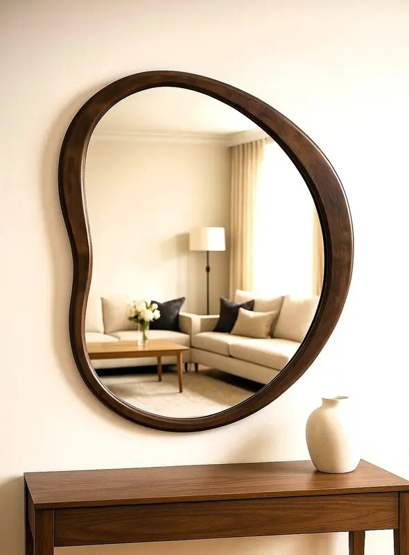 מראת קיר אמורפית זו היא פריט הצהרה המשלב בין פונקציונליות לבין עיצוב חופשי ונועז. המסגרת העבה והמעוגלת, המגולפת בעץ איכותי בגוון אגוז כהה, מדגישה את הקווים הזורמים והרכים של המראה. הצורה הלא-שגרתית, בהשראת צורות טבעיות, הופכת כל קיר למוקד עניין מיידי. מידותיה הגדולות מבטיחות שהיא תהפוך למרכז החדר, תרחיב את החלל ותגביר את כמות האור באופן דרמטי. המראה מתאימה במיוחד למי שמחפש לשדרג את הבית בפריט עם נוכחות דומיננטית, והיא מושלמת להצבה מעל קונסולה בכניסה, כאלמנט מרכזי מעל ספה בסלון, או בחדר השינה המודרני. קל לתלות אותה והיא מגיעה מוכנה לשימוש מיידי.