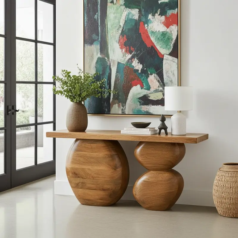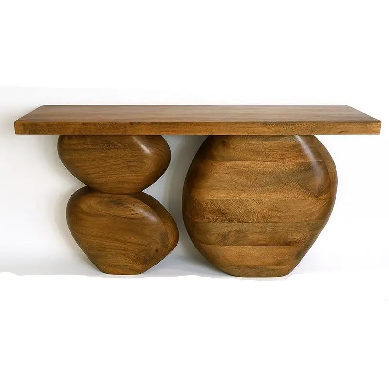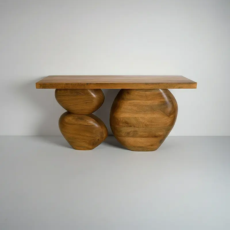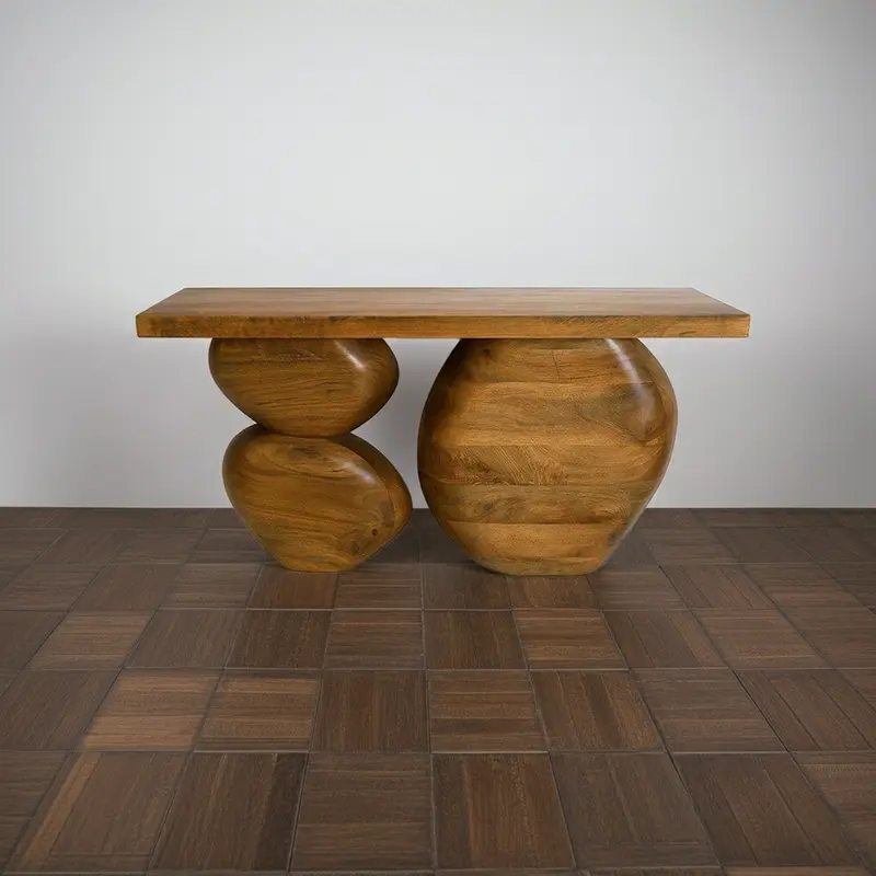 קונסולת אבן דרך היא מפגש ייחודי בין פונקציונליות לאמנות פיסולית. עשויה עץ מנגו מלא ואיכותי בגימור דבש חם (Honey), הידוע בעמידותו ובמרקם העץ המרהיב שלו. גולת הכותרת היא הבסיס הפיסולי, המורכב מצורות מעוגלות, כמעט אורגניות, שנוצרו בהשראת הטבע. מבנה זה מעניק לקונסולה יציבות מוחלטת ומראה דרמטי ועוצמתי. עם אורך של 130 ס"מ, היא מספקת פלטפורמה רחבה להצגת חפצי נוי, מראות או אחסון מפתחות בכניסה. השילוב של העץ החם והעיצוב המודרני-אורגני מתאים באופן מושלם לחללים אקלקטיים, בוהו שיק, או עיצוב מינימליסטי המבקש אמירה. הוסיפו מנורה מעוצבת או עציץ גדול וצרו פינה שתהפוך למוקד השיח בכל בית.