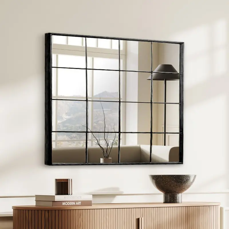 הכניסו את הנוף האורבני הדרמטי לתוך הבית שלכם. מראת ריבועים מלבנית מעוצבת זו היא לא רק השתקפות – היא יצירת אמנות שמרחיבה את החלל, מוסיפה עומק ונגיעה של שיק תעשייתי, מראה שתהפוך קיר רגיל לחלון של סטייל.מסגרת מתכת בגוון שחור משלימה את הלוק היחודי.