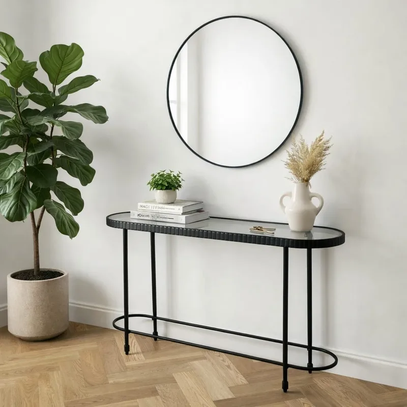 במבואת הכניסה, מומלץ להניח על מדף הזכוכית צמד מראות קשת אופק בגבהים שונים כדי להוסיף עומק. לצדן, הניחו מגש מתכת שחור קטן עבור מפתחות ומפיץ ריח יוקרתי בגוון זהב או נחושת, ליצירת ניגודיות חמימה עם המסגרת השחורה.