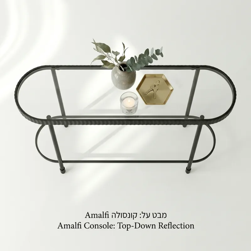 קונסולת אמאלפי היא פריט המעבר המושלם מאירוח חגיגי לארוחת ערב משפחתית נינוחה. המבנה האובלי המוארך שלה, המזכיר את קווי החוף המפותלים של אמאלפי, מעניק לחלל אווריריות ומרחב. מדף הזכוכית השקוף, השקוע בתוך מסגרת המתכת השחורה והדקה, מאפשר להציג לראווה פריטי דקורציה אהובים או חפצים יומיומיים מבלי להעמיס ויזואלית על המקום. זהו "קנבס" חלק ויוקרתי הממתין לנגיעה האישית שלכם.