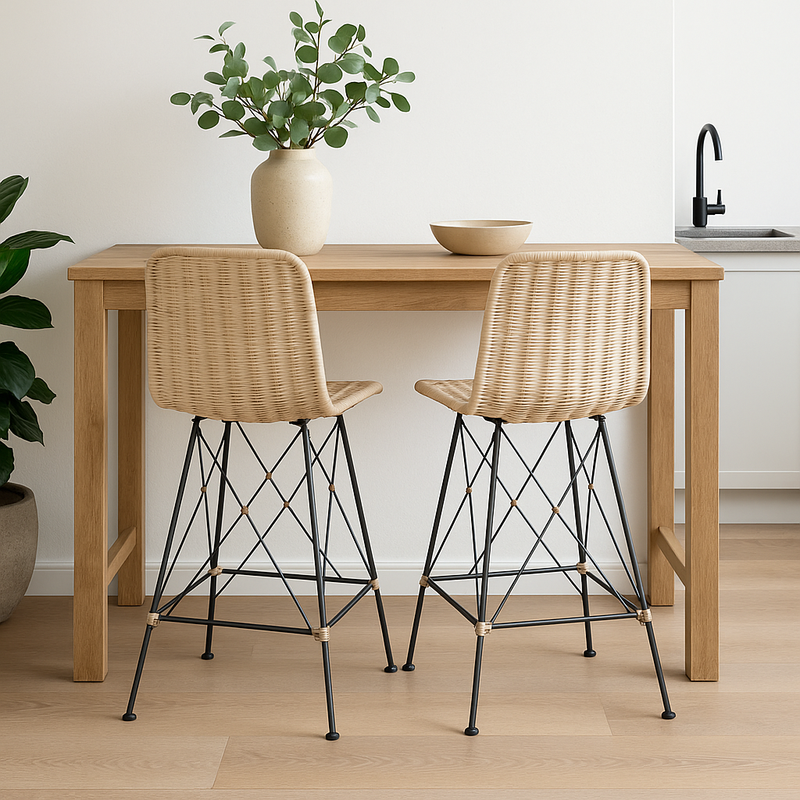 כיסא בר מראטן אמיתי , סטייל טבעי בגובה הנכון.כיסא בר בעיצוב ייחודי שמשלב מראה טבעי, נוחות מודרנית ועמידות לאורך זמן. עשוי מראטן אמיתי קלוע בעבודת יד, בגוון בהיר ומרגיע, עם רגלי מתכת בגימור אלגנטי – שילוב מדויק בין חמימות וטבעיות לאסתטיקה עכשווית. מושב בגובה 60 ס"מ – אידאלי לבר בגובה 90 ס"מ. מתאים למטבחים, אי מרכזי, ברים ביתיים או חללי אירוח מעוצביםכ ,יסא בר שמכניס טאץ'' חמים וטבעי לכל פינה בבית, תוך שמירה על קווים נקיים ונוכחות אלגנטית.