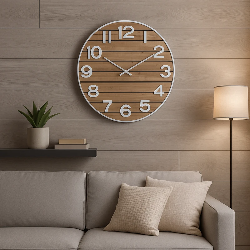 עם גודל מרשים של 80 ס"מ, השעון מהווה מוקד תשומת לב בסלון, במשרד או בחדר השינה. הרקע העשוי מעץ חם בשילוב עם ספרות בולטות בצבע לבן מעניקים לו נוכחות אלגנטית ואסתטיקה מושכת.