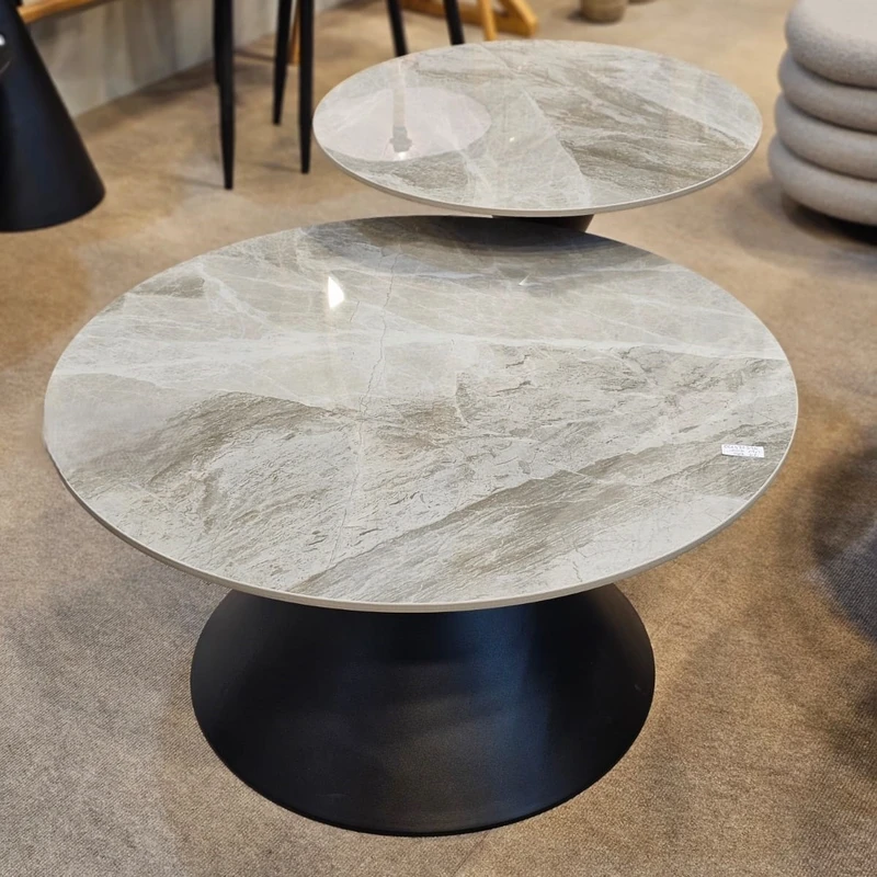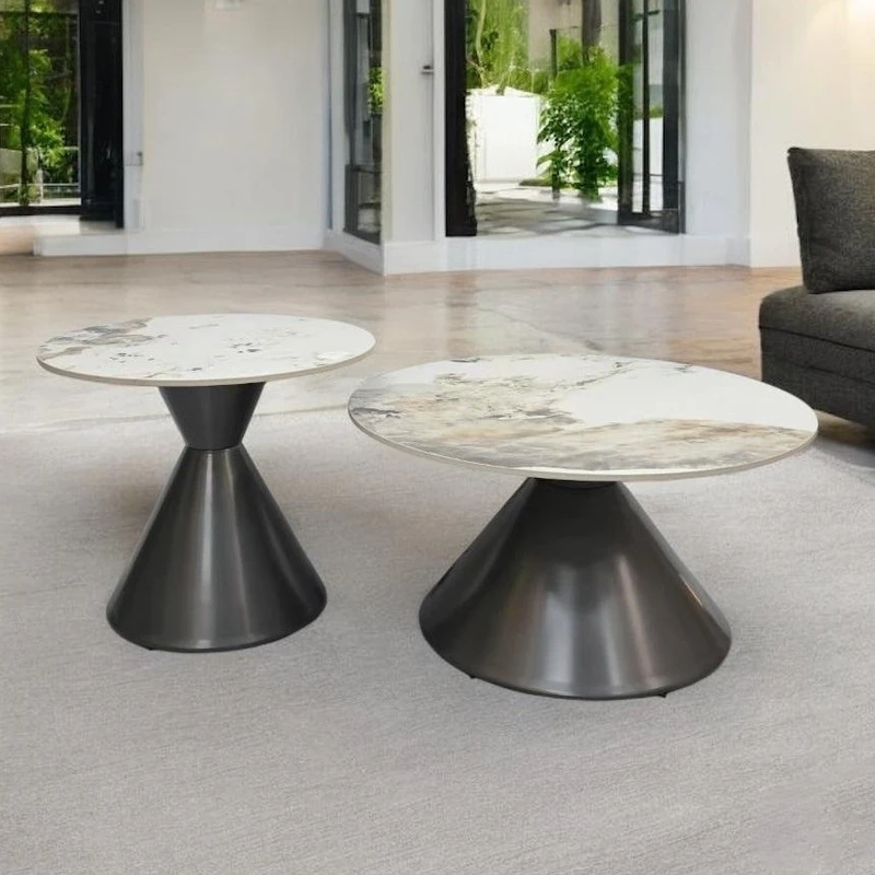 סט שולחנות הקפה מטאל מארבל מבית Studio 26 Shop הוא יצירת אמנות פונקציונלית המיועדת להעניק לביתכם מראה יוקרתי ומעודכן. הסט כולל שני שולחנות עגולים בגדלים משתנים, המאפשרים גמישות בעיצוב ושימוש – כסט של שולחנות קפה, כשולחנות צד נפרדים, או כאלמנט עיצובי יחיד המושך את העין. פלטות השולחנות עשויות מחומר עמיד בגימור מבריק דמוי שיש בגוונים אפורים-בז', המעניק מראה טבעי ואלגנטי עם קלות תחזוקה. בסיסי השולחנות מעוצבים בצורת קונוס הפוך בצבע שחור, עשויים מתכת יציבה וחזקה, המבטיחה יציבות ועמידות לאורך שנים. השילוב בין פלטת השיש המודרנית לבסיס השחור התעשייתי יוצר ניגוד הרמוני המשדרג כל סלון, חדר אירוח או פינת ישיבה. מושלם לבתים המחפשים פריט בעל נוכחות, איכות וסגנון ייחודי.
