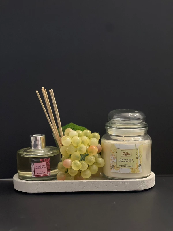 מארז סט ניחוח העמק על מגש אבן אובלי הוא הפריט המושלם ליצירת פינת חמד מעוצבת ומרגשת בכל חלל. הסט כולל מגש דקורטיבי המהווה בסיס מושלם לקומפוזיציה. עליו מונחים מפיץ ריח יוקרתי (200 מ"ל) עם מקלות במבוק טבעיים, המשחרר בעדינות ובאופן מתמשך ניחוח קלמנטינה ורימונים ממכר, ונר ריחני (14 oz), הכלוא בצנצנת זכוכית מעוצבת, המעניק אור חם ונעים. אשכול ענבים מלאכותי, מציאותי להפליא, משלים את המראה הטבעי ומוסיף נופך של שפע. מארז ניחוח העמק מעורר תחושת רעננות, אופטימיות וחיוניות, ומעורר זיכרונות נעימים . הסט אידיאלי להנחה בסלון, בפינת האוכל, על שידת צד בחדר השינה או בחדר העבודה, ומוסיף מיד מימד של סטייל, רוגע וחיבור לטבע. הוא עשוי מחומרים איכותיים ועמידים, קל לניקוי ותחזוקה, ויהווה מתנה יוקרתית ומרגשת לכל אירוע.