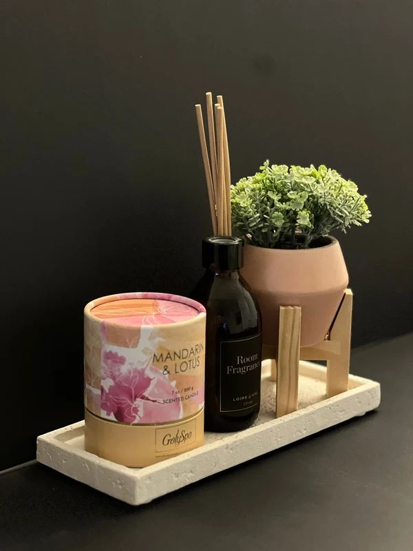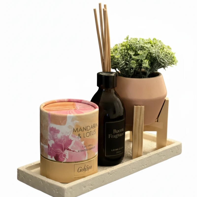 מארז מושלם המכיל מגש אבן מלבני, מבשם איכותי נר אוירה במארז מעוצב ועציץ נוי מלאכותי להשלמת האוירה, מושלם לחדרי מגורים, חדרי שינה, חדרי אמבטיה או כמתנה אלגנטית ומלאת כוונה לעצמך או למי שיקר לליבך.