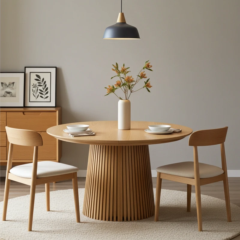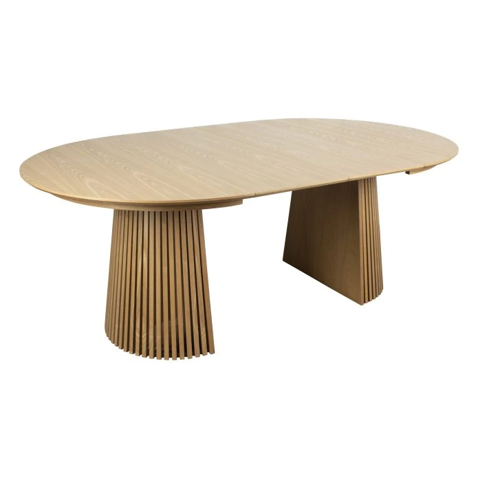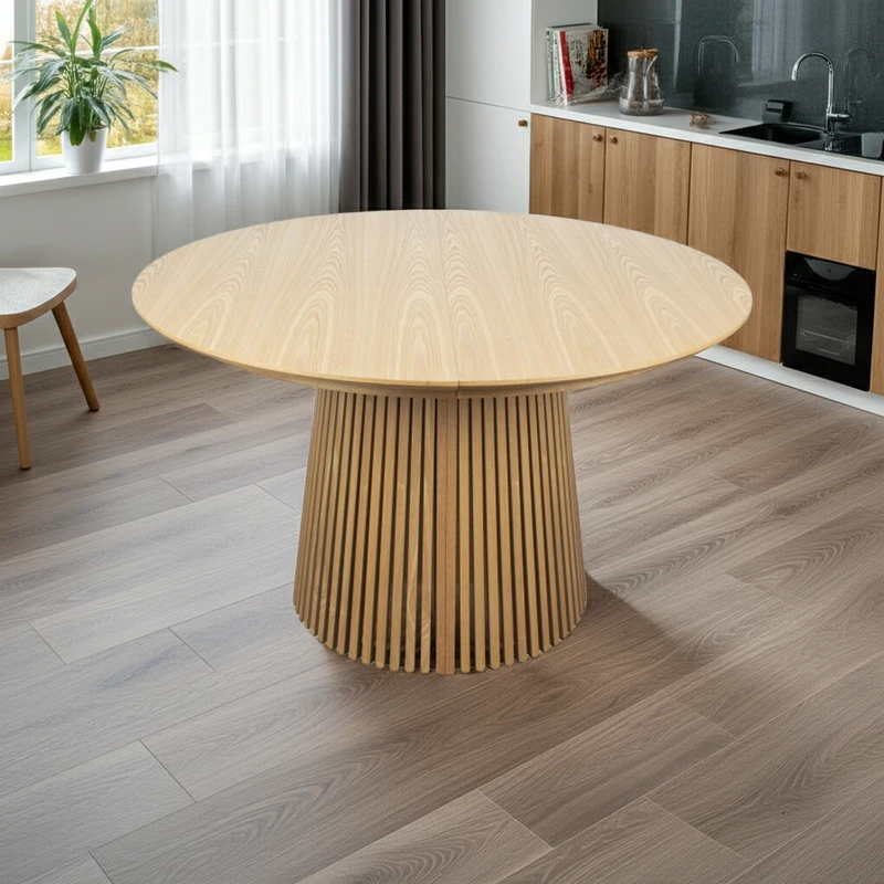 שולחן אוכל נפתח שהוא יצירת אמנות פונקציונלית. הפלטה העליונה מעוצבת בצורה מעוגלת ורכה, עשויה מפורניר אלון איכותי בגימור בהיר, המעניק חמימות ואור לחלל. גולת הכותרת היא הבסיס הכפול והדרמטי, המעוצב מפסי עץ אנכיים היוצרים אפקט ויזואלי עשיר ונוכחות פיסולית. השולחן כולל מנגנון הארכה קל ואיכותי המאפשר הוספת חלק מרכזי, כך שניתן לשנות את גודלו בקלות כדי להתאים למספר האורחים המשתנה. מושלם לחללי מגורים בסגנון סקנדינבי, יפנדי או מינימליסטי מתוחכם. חובה למי שמחפש פריט המשלב יציבות, איכות חומרים ועיצוב אמוציונלי חזק.