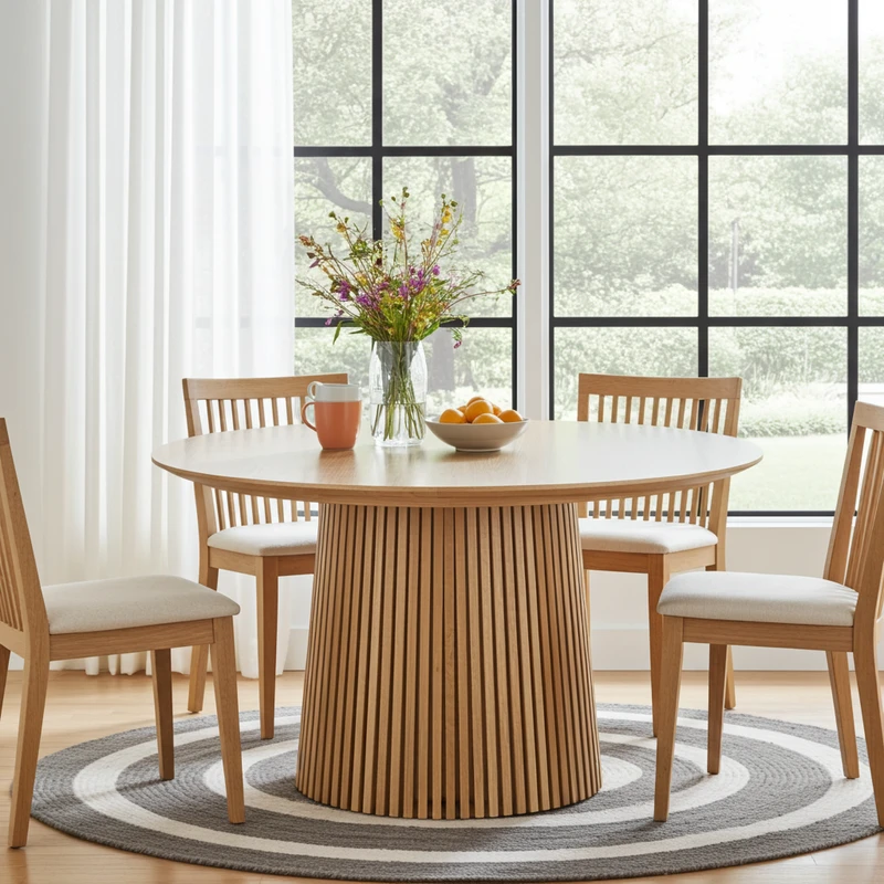 פינת אוכל בסגנון כפרי מודרני קוטר 120 ס"מ מעץ אלון ופלטה פורניר אלון בעל שתי הגדלות של 40 ס"מ מאמצע הפלטה המאוחסנות מחוץ לשולחן ,סה"כ במצב פתוח 2 מטר,מה שיספיק ל כ- 10 סועדים.