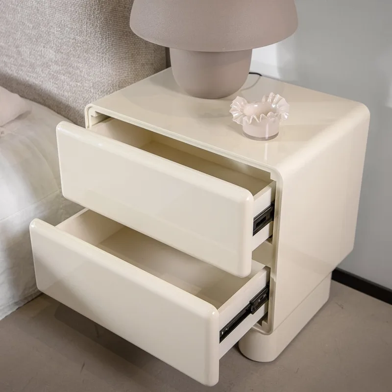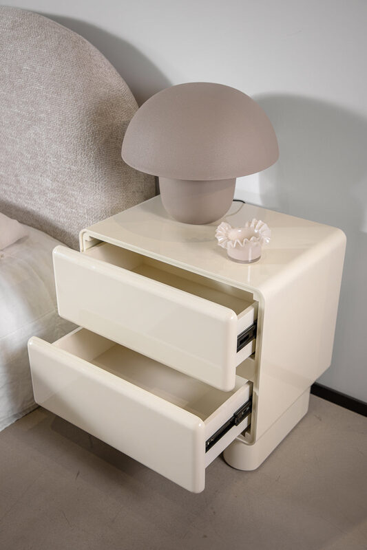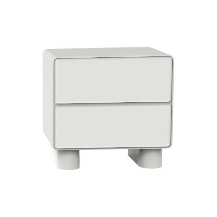 שידה גלוסי ריבועית בצבע לבן. שידת חמד שובה, המעוצבת זוג מגירות בגימור חלק.